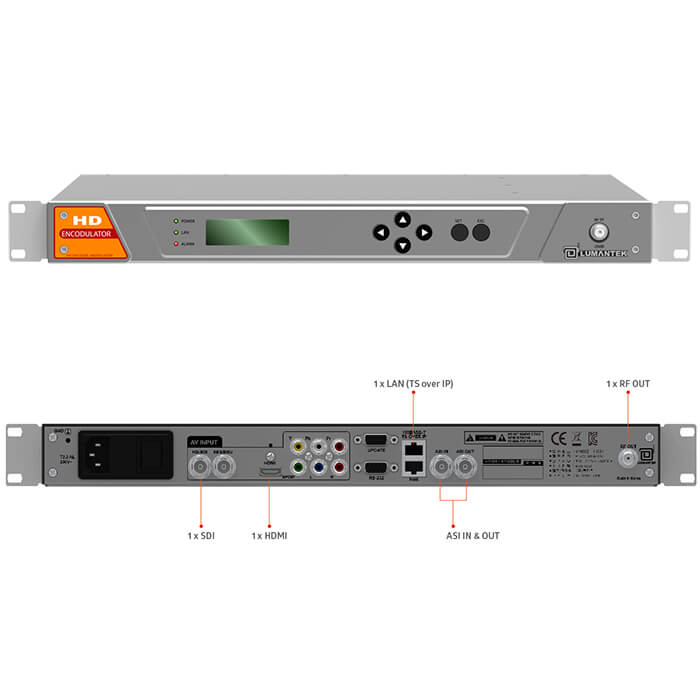 LUMANTEK HD Encodulator is HD encoder packaged with modulators in a single 1RU. Supported modulations include DTV standards such as ATSC, QAM, DVB-T, and DTMB.